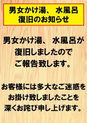 2026/02/24 重要なお知らせ 設備故障のお詫び 平素は天然温泉 龍の湯をご愛顧頂き、誠にありがとうございます。ただいま、男女かけ湯と男女水風呂の濾過機が故障しております。かけ... 2026/02/11 お知らせ 休館日のご案内 3月17日(火)は休館日となります。 2026/01/22 お知らせ 節分豆 数当てクイズ! 2月3日(火)まで館内に設置されている枡の中に豆はいくつ入っているでしょう?豆の数を予想して投票してください!正解者には抽選でペ... 2026/01/04 お知らせ 休館日のご案内 1月20日(火)は休館日となります。 過去のお知らせはこちら ▶