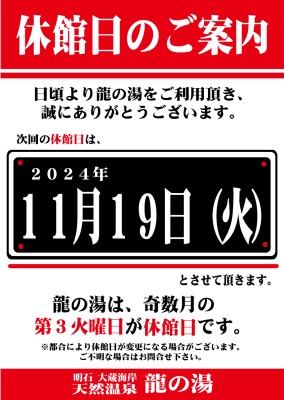 2025/11/14 お知らせ 休館日のご案内 11月18日(火)は休館日となります。 2025/11/03 重要なお知らせ 入浴回数券および入浴料金価格改定のお知らせ 大人入浴料金(中学生以上)平日 800円 土日祝 900円幼児入浴料金 平日 150円 土日祝 200円レンタルタオル 150円販売用タオル 200円 2025/11/02 お知らせ 神戸マラソンの日も営業中 11月16日(日)開催の神戸マラソンの日も通常通り午前7時から営業しています!今年はコースが変更になり、龍の湯付近で交通規制が行われ、... 2025/11/01 お知らせ 11月は健康茶風呂 11月3日(月)~11月30日(日)の期間、4週にわたり露天風呂にて健康茶風呂を開催します。本物の茶葉を使用したお風呂をぜひお楽しみくださ... 過去のお知らせはこちら ▶