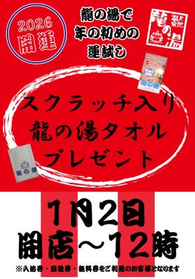2025/12/09 お知らせ 冬至はゆず湯 12月22日(月)はゆず湯を実施します。冬至はゆず湯でぽっかぽかに温まってください! 2025/12/09 お知らせ 年末年始のお知らせ 年末年始も休まず営業!※12月29日(月)~1月2日(金)は休日料金とさせていただきます。 2025/12/08 お知らせ 1月2日はタオルスクラッチ 1月2日開店~12時龍の湯で年の初めの運試しスクラッチ付龍の湯タオルプレゼント!※入浴券・回数券・無料券をご利用のお客様が対象とな... 2025/12/08 お知らせ 2026年元旦~1月3日 祝酒風呂開催! 2026年元旦~1月3日露天岩風呂に日本酒を投入します。どうぞ、日本酒風呂を心ゆくまでお楽しみください! 過去のお知らせはこちら ▶