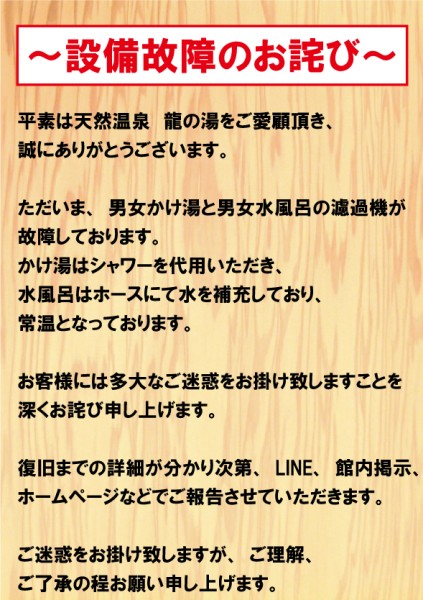 平素は天然温泉 龍の湯をご愛顧頂き、
