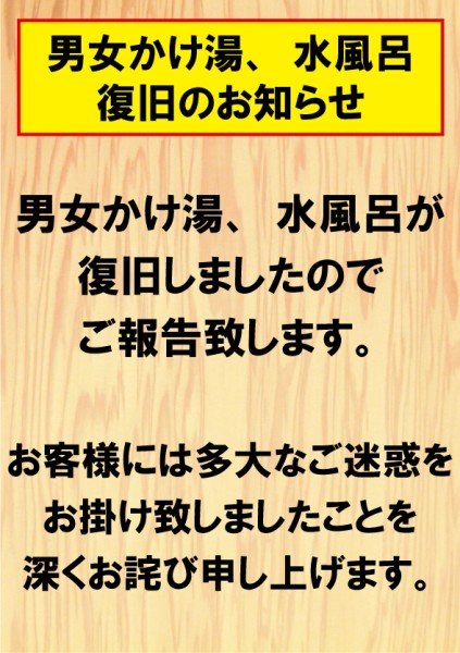 男女かけ湯、水風呂復旧のお知らせ